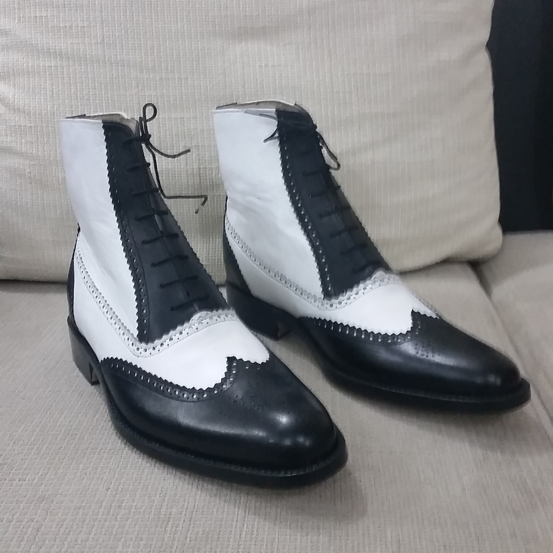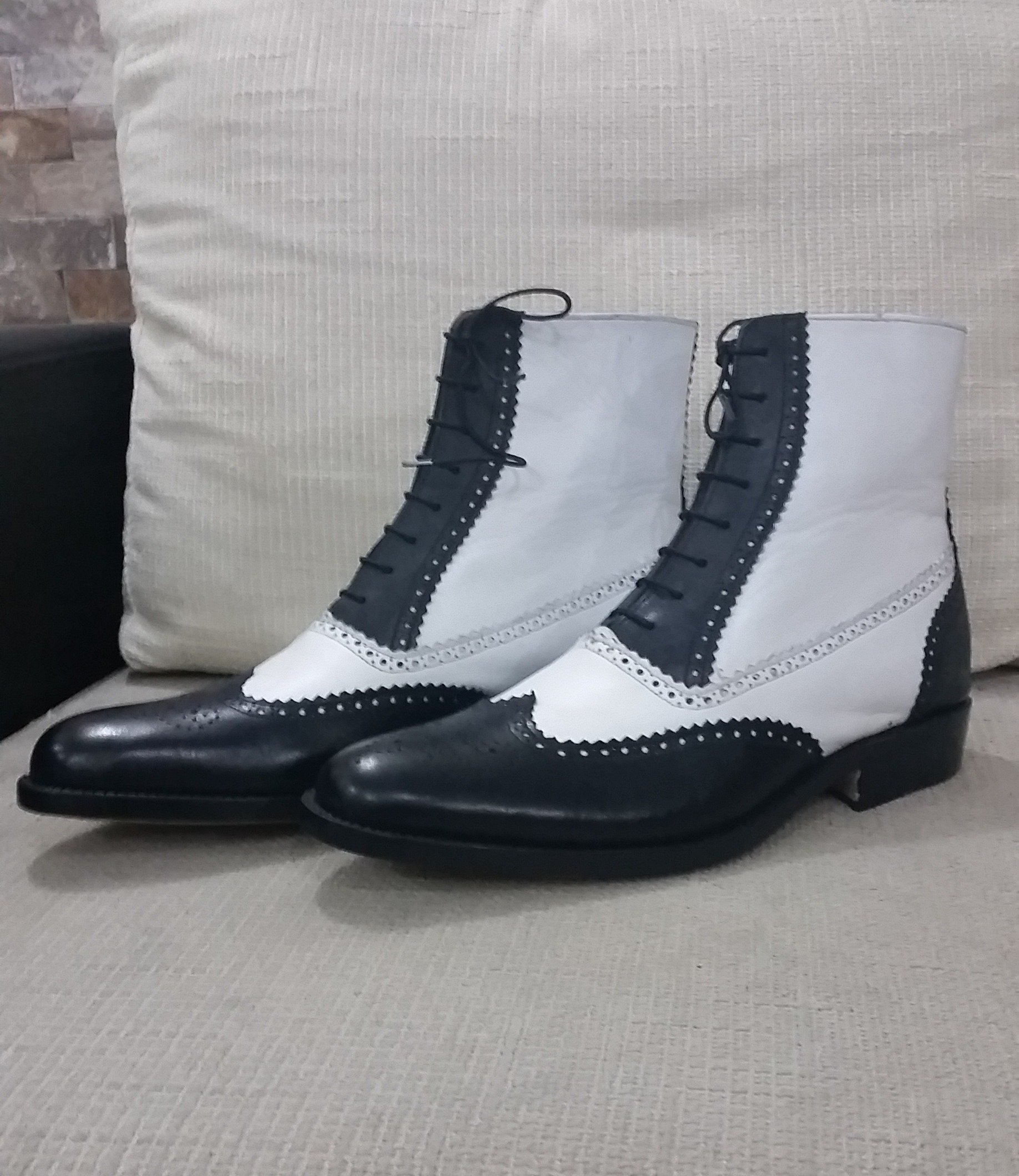 Black White Leather Wingtip Ankle High Boot, Men Lace up Dress Boot