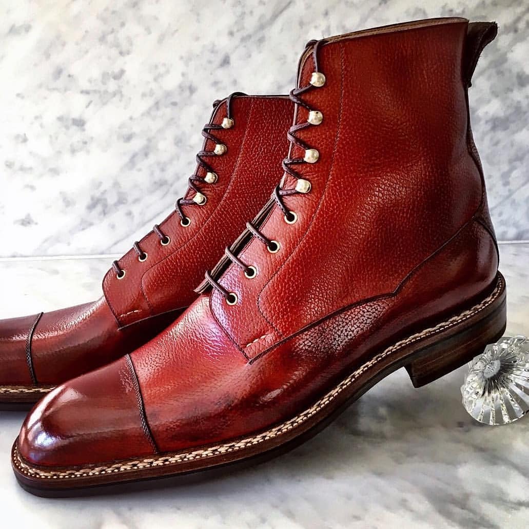 Handmade Red Derby Ankle High Lace up Hunting Boots with Straight Toe Cap Hatch Grain with 360 storm welt and Dainite sole.