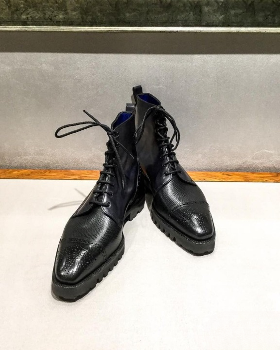 Handmade Black Calf in Black Hatch Grain Ankle High Lace up Commando Boot