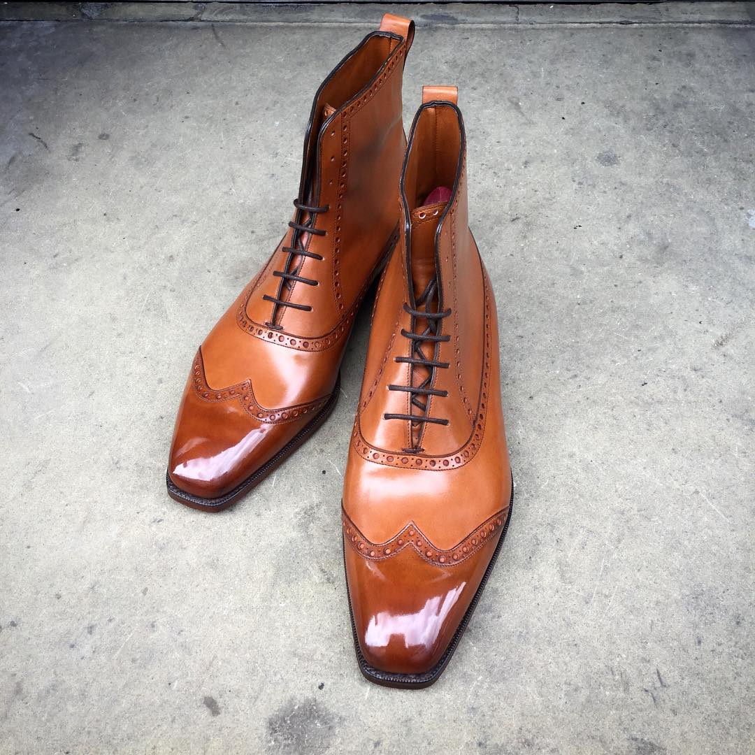 Handmade Mens Vintage Chestnut Calf Skin Leather Ankle High Wingtip Lace up Boot