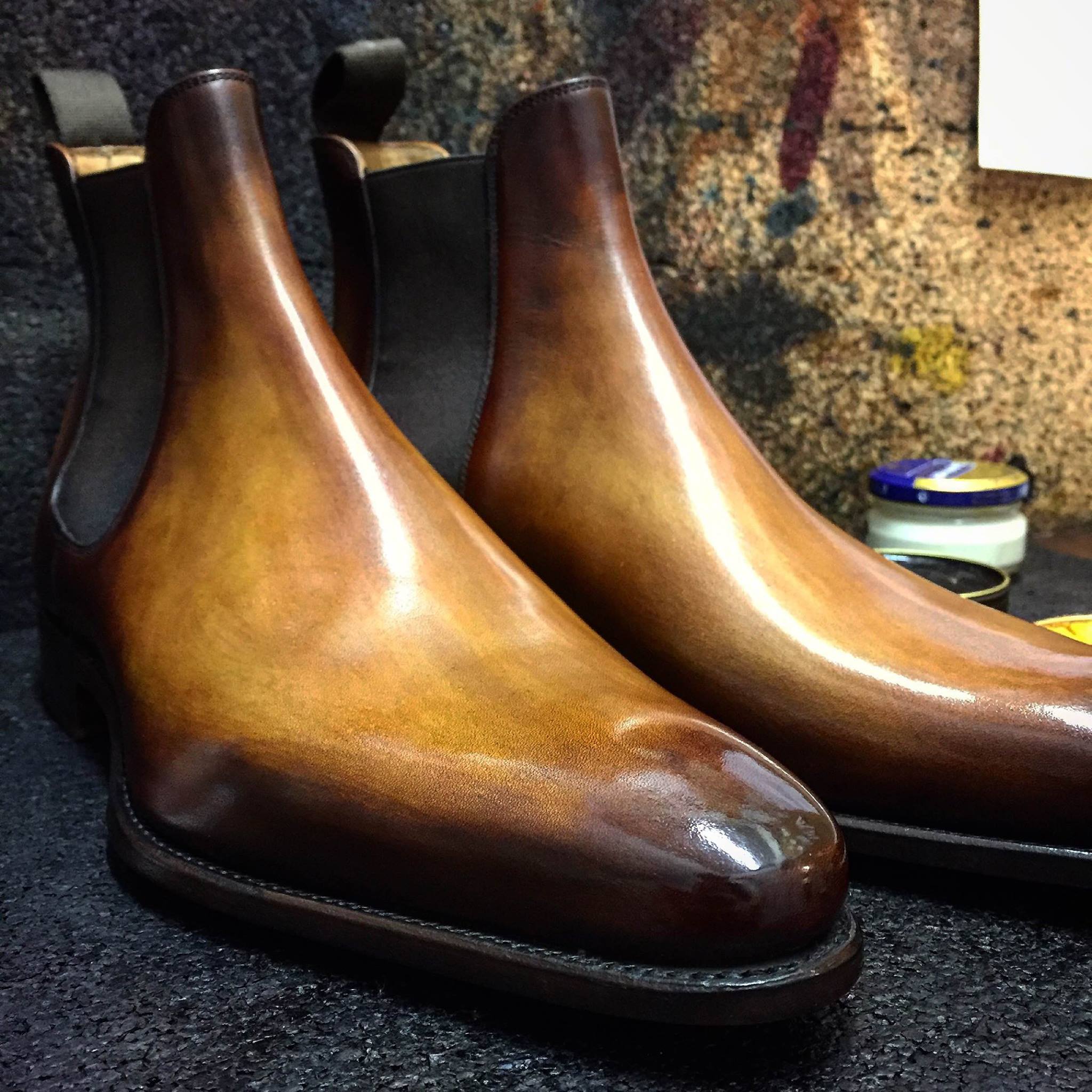 Upper: High Quality Cognac Brown Patinated Leather Men Chelsea Boot