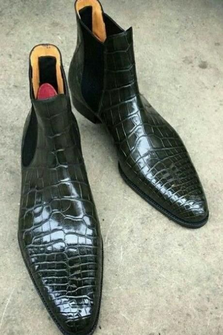 Handmade Men's Crocodile Texture Leather Chelsea Style Boot