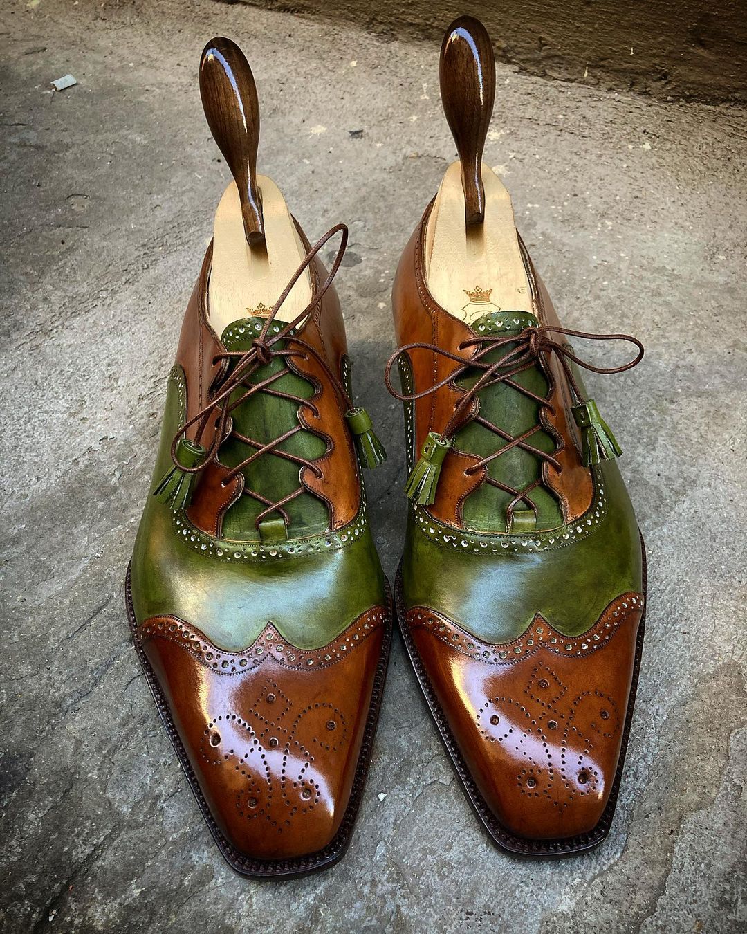 Inner: Soft Sole: Leather Gender : Male Heel: Leather Color: Brown and Green Style: Wingtip Oxford Shoes Lining Soft Calf Leather Lining Totally Hand stitched Manufacturing time 7-10 business days If you can’t find your Size/Color just send us message we will make for you.