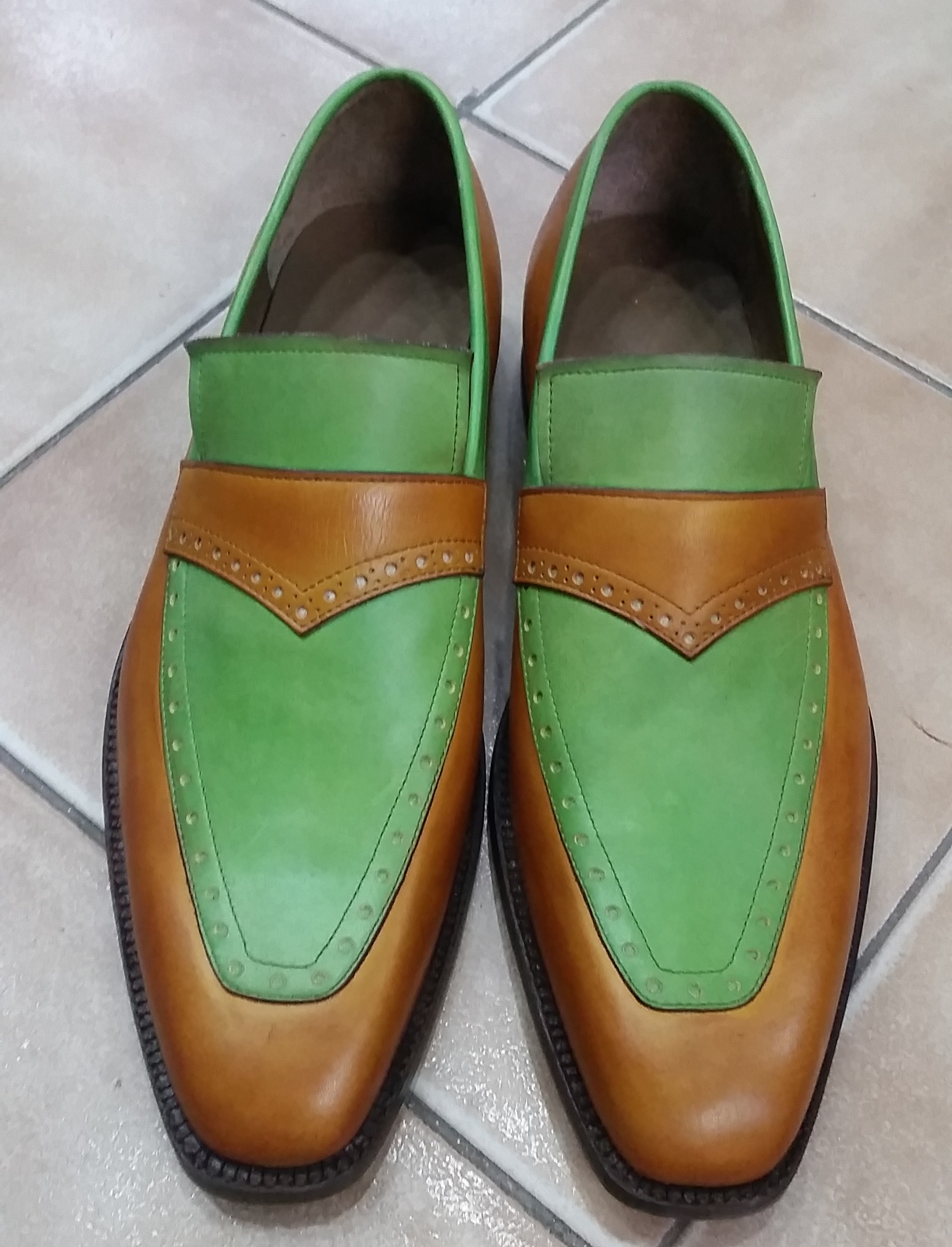 Inner: Soft Sole: Leather Gender : Male Heel: Leather Color: Brown / Green Style: Loafers Shoes Lining Soft Calf Leather Lining Totally Hand stitched Manufacturing time 7-10 business days If you can’t find your Size/Color just send us message we will make for you.
