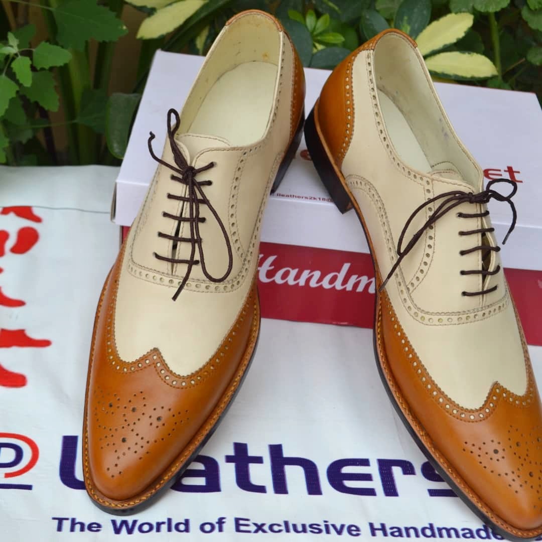 Bespoke Handmade Brown Beige Leather Wingtip Oxford Pointed Toe Dress Shoes