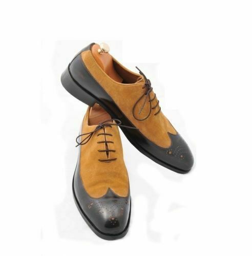 Mens Handmade Shoes Black Leather Tan Suede Two Tone Wingtip Formal Wear Boots