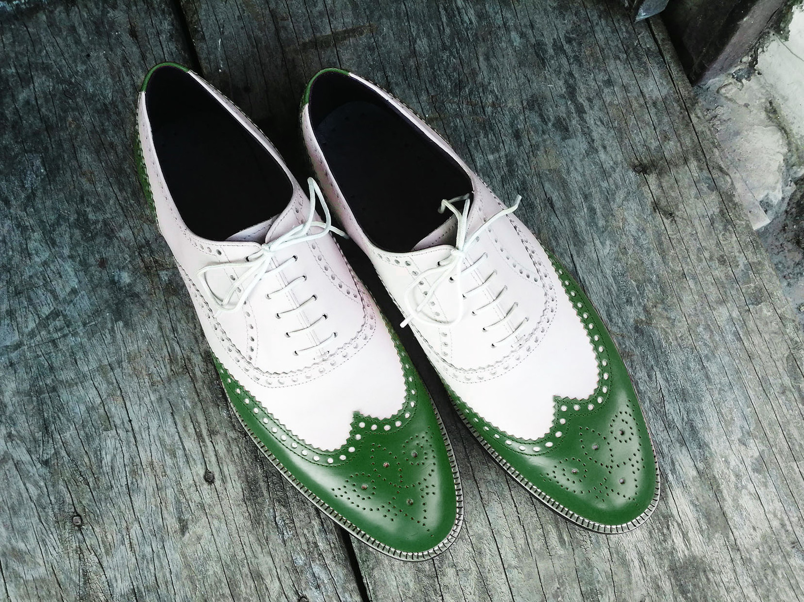 Genuine Two Tone Green White Leather Handcrafted Oxford Lace Up Men Shoes
