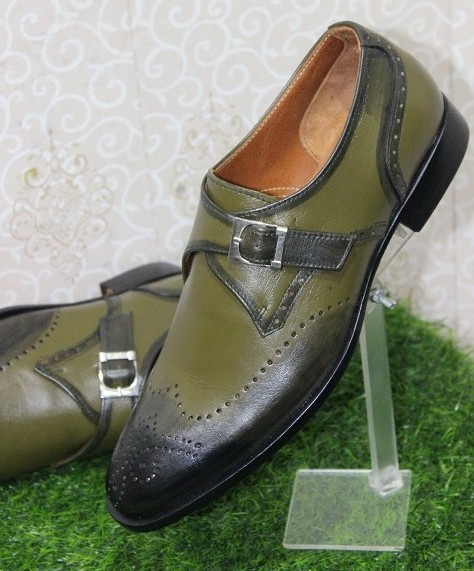 New Men's Handmade Formal Shoes Two Tone Green Leather Single Monk Wing Tip Style Dress & Casual Wear Shoes