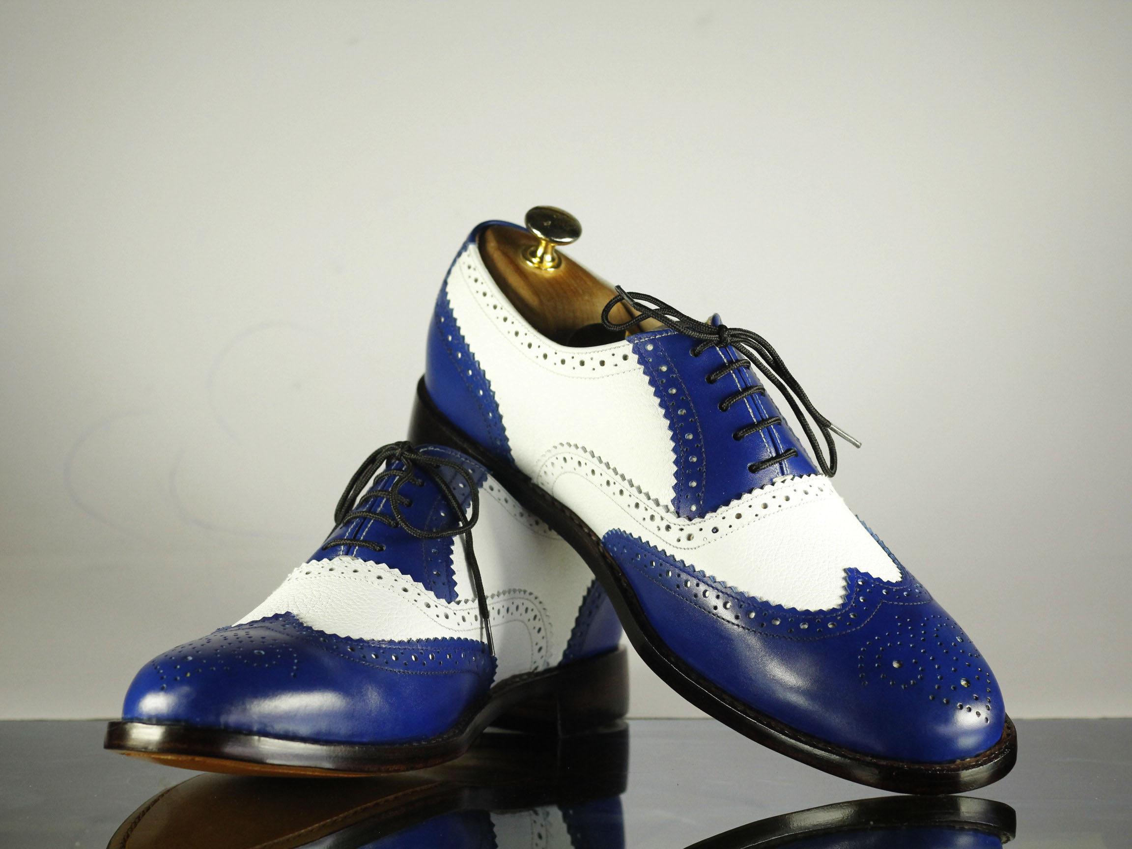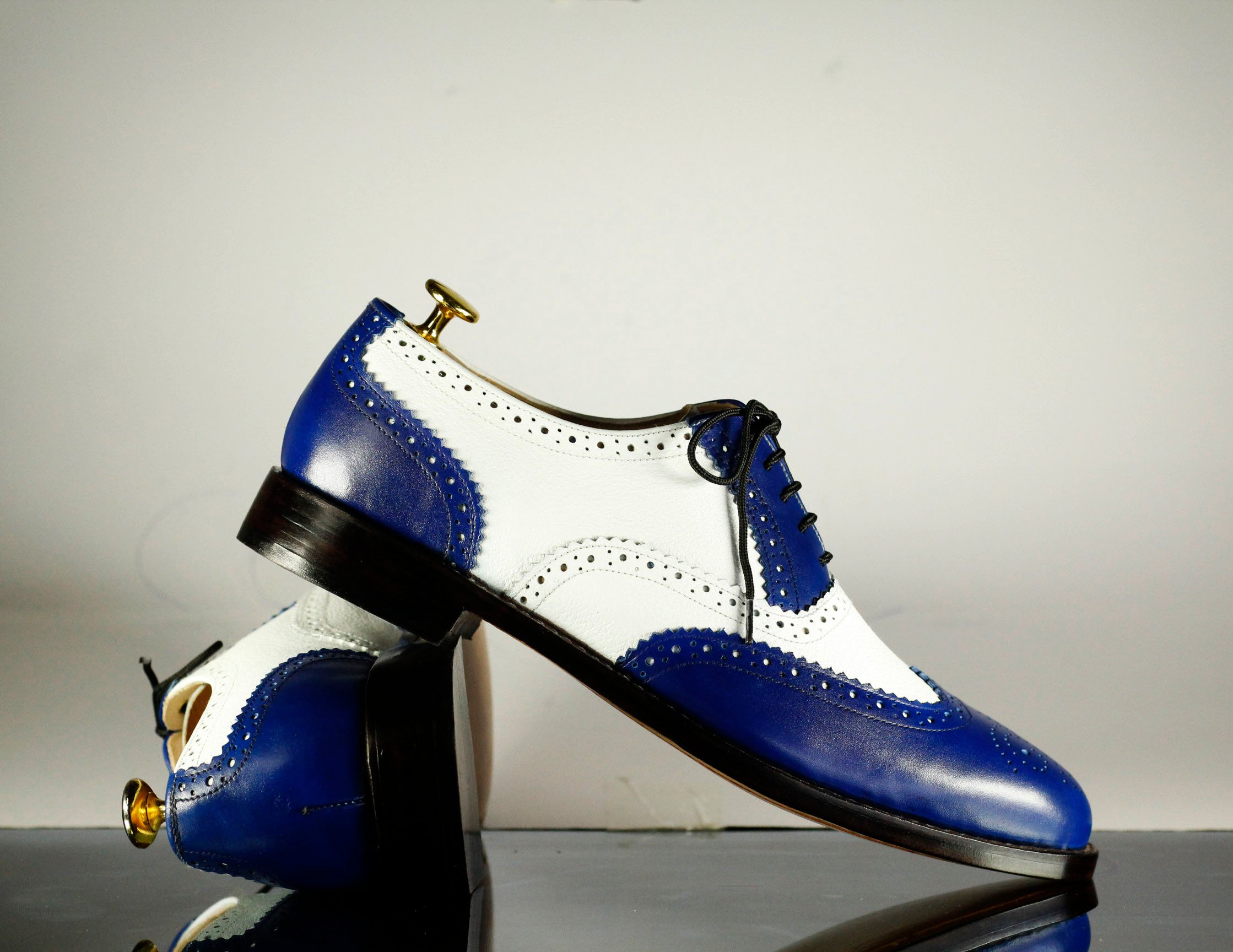 New Handmade Men's Blue White Leather Wing Tip Brogue Lace Up Shoes