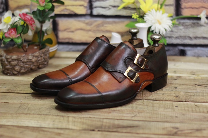 New Men's Handmade Formal Shoes Two Tone Brown Leather Double Buckle Monk dress & Casual Wear Shoes